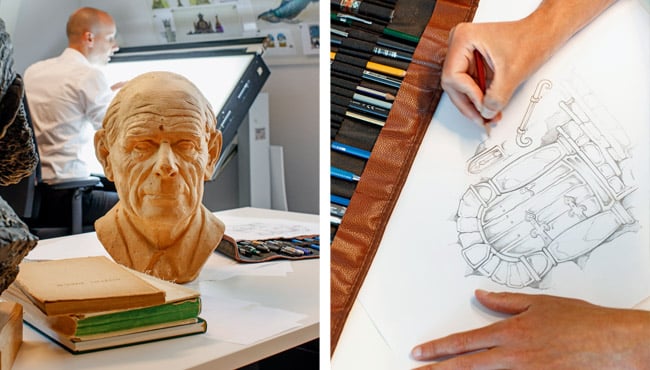 Schetsen doe ik het liefst aan mijn tekentafel met potlood en papier. Natuurlijk kan het ook digitaal, maar voor mij persoonlijk zit er iets moois in tekenen op papier. Dan komt er een soort rust in mijn hoofd. Een tekening op papier heeft zoveel meer zeggingskracht. Bovendien heb ik op die manier de beste dialoog met Anton Pieck en mijn andere voorgangers. En waarom zou ik iets wat goed werkt veranderen? Esthetiek en technisch ontwerp ontmoeten elkaar constant tijdens een project. En dat moet ook. Want zonder de bewegingen en de muziek is het echt zo leuk niet in de Efteling. Samen met collega’s van allerlei disciplines maken we een ontwerp steeds iets mooier en beter. Die magische samenwerking vind ik het allermooiste van mijn vak.”