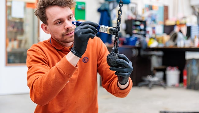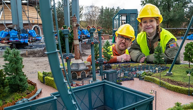Max fährt fort: „Der 14,5 Meter hohe Schornstein ist inzwischen frei von Gerüsten. Der Name der Attraktion ist schon von Weitem zu lesen. Auch die drei Lifttürme sehen schon richtig gut aus. In diesen Wochen tragen wir die letzten Farbschichten auf. Mit einem großen Kran wurden die Förderräder oben auf die 12 Meter hohen Türme gesetzt. Sie ähneln stark dem großen Rad bei der Goldmine, aber wer genau hinsieht, entdeckt bei Hooghmoed ein kleines Feuer statt Spitzhacke und Schaufel. Dieses Feuer findest du an mehreren Stellen der Schmelze wieder – zum Beispiel an den Türen unter dem Schornstein und an den drei Lifttürmen. Beim Häuschen des Operators steht bald ein großer Bedienhebel. Dieser wird derzeit noch in der Werkstatt dekoriert. Sobald die Schornsteinfeger Platz genommen haben, drückt der Operator einen der Hebel nach unten und setzt so die Attraktion in Bewegung.“