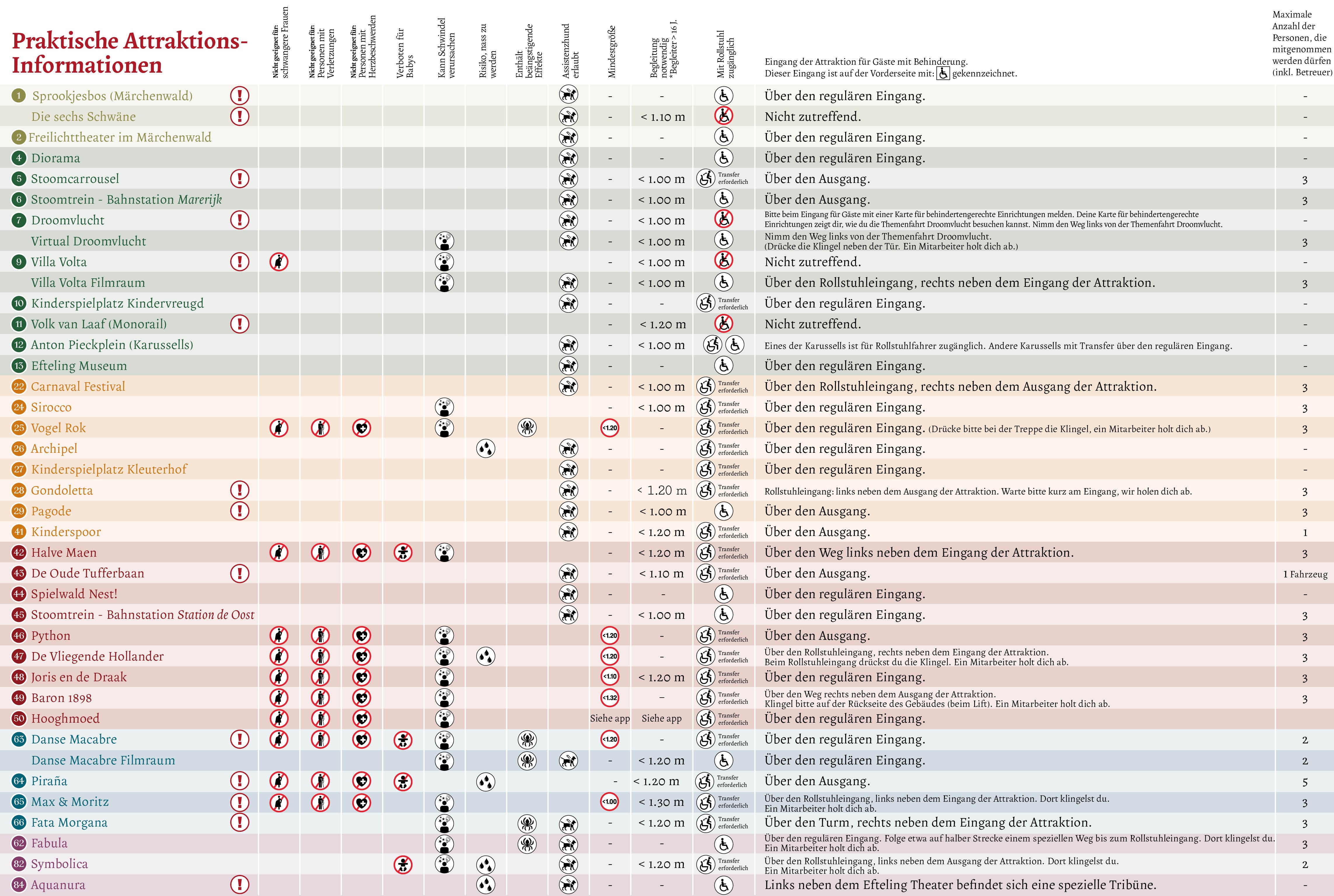 Die Zugangsbeschränkungen werden mithilfe von Symbolen angezeigt. Du findest diese Symbole auch auf der Website bei den einzelnen Attraktion, in der Efteling-App, beim Eingang zu den Attraktionen und auf dem speziellen Parkplan für Besucher mit Behinderung. Diesen Parkplan kannst du dir gegen Vorlage deiner Karte für behindertengerechte Einrichtungen beim Gästeservice abholen. In diesem Parkplan findest du jede Menge nützliche Tipps und praktische Informationen über die Zugänglichkeit von Attraktionen und Toiletten, den Zugang über den Rollstuhleingang, die Zugänglichkeit mit Begleit- oder Assistenzhunden und vieles mehr. Möchtest du dir schon mal eine Übersicht der Zugangsbeschränkungen für die verschiedenen Attraktion ansehen?
