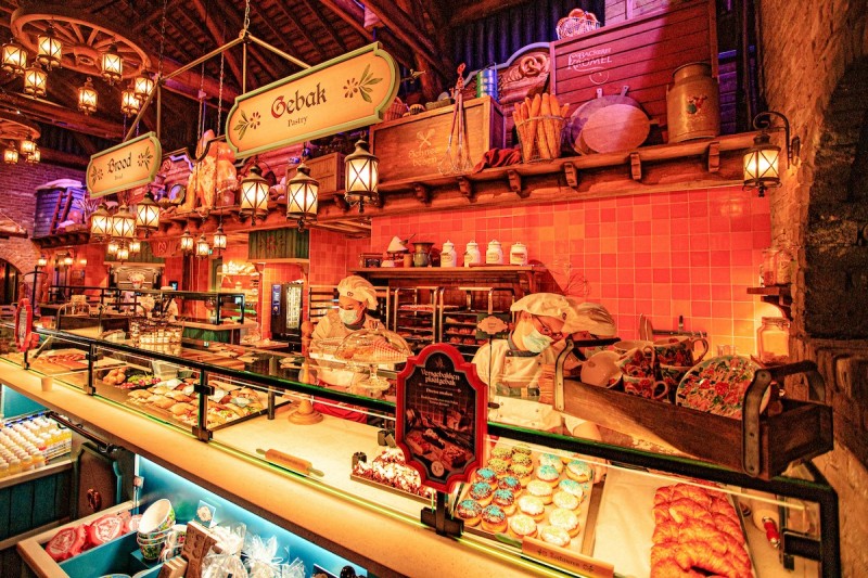 Mit seinen Fensterläden, dicken Holzbalken und thematischen Malereien fügt sich das Gebäude perfekt in das alpenländische Dorf ein, das Efteling für Max und Moritz geschaffen hat. Im Innenbereich der Bäckerei finden unter normalen Umständen 125 Personen Platz, 50 weitere Gäste können im Außenbereich essen und trinken. Gastro-Projektmanager Melvin van Brakel erklärt: „Das Haus erinnert an eine gemütliche, süddeutsche Konditorei. Mittelpunkt ist ein nostalgischer Doppelstockofen, der von einer deutschen Traditionsfirma hergestellt wurde. Hierin werden Leckereien für Frühstück, Mittag- und Abendessen aufgebacken.“