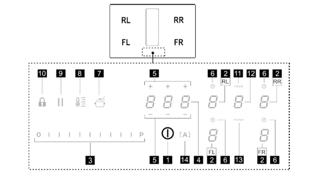 4. Schalte das Kochfeld aus, indem du die EIN/AUS-Taste (Taste 1) drückst. Auf dem Display der genutzten Zone erscheint dann ein ‘H’. Das bedeutet, dass das Kochfeld noch Restwärme hat.