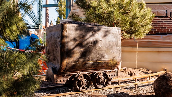 Max continues: “The 14.5-metre-high chimney is now free of scaffolding. The name of the attraction can already be read from afar. The three lift towers are also really taking shape. We’re applying the final layers of paint over these weeks. Using a large crane, the shaft wheels have been placed on top of the 12-metre-high towers. They look very similar to the large wheel at the gold mine, but if you look closely, you’ll see that at Hooghmoed a little flame is depicted instead of a pickaxe and shovel. You’ll spot that flame in several places around the smeltery—on the doors beneath the chimney, for example, and at the three lift towers. Near the operator’s cabin, there will soon be a large control lever. It’s currently still being decorated in the workshop. Once the chimney sweeps have taken their seats, the operator pushes one of the levers down, setting the attraction in motion.”