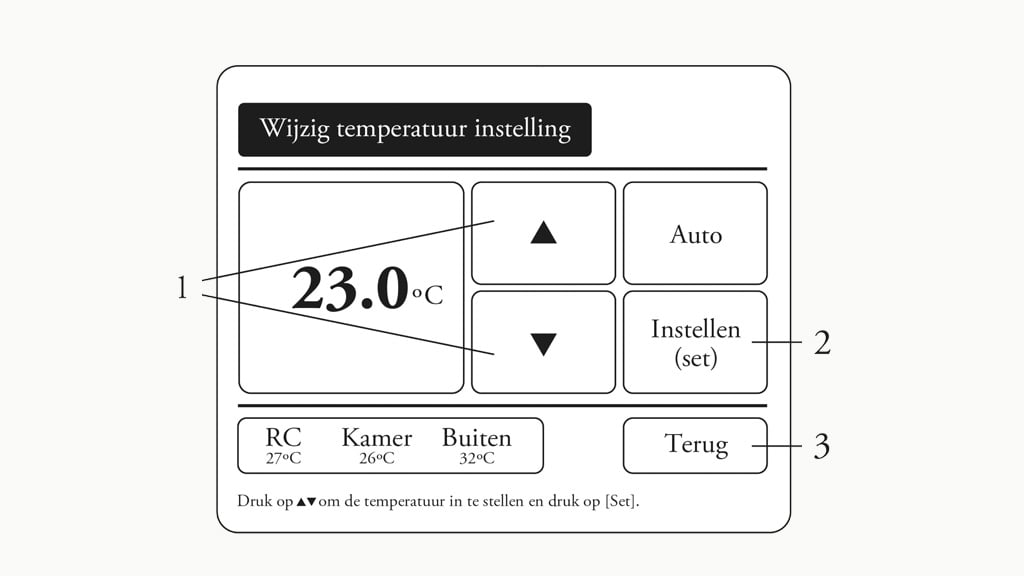 *If you press ‘’Terug (back)‘’ without pressing the ‘’Instellen (set)‘’ button, the selected temperature will be ignored and you will return to the main screen.