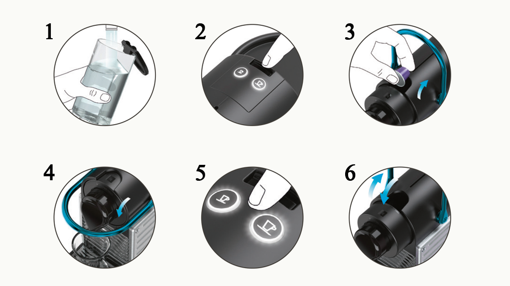 4: Close the capsule clamp by pulling it towards you. Place a cup under the coffee spout. Never open the capsule clamp when the machine is operational.
