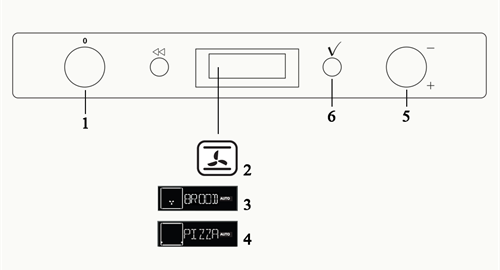 1. Select the desired oven setting by turning the function knob (knob 1). The display shows which function has been selected: