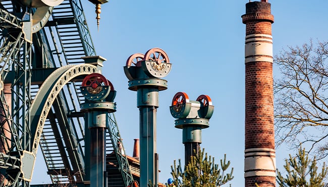 Max poursuit : « La cheminée de 14,5 mètres de haut est désormais libérée de ses échafaudages. Le nom de l’attraction est déjà visible de loin. Les trois tours de levage prennent également belle allure. Nous appliquons actuellement les dernières couches de peinture. À l’aide d’une grande grue, les roues d’extraction ont été placées au sommet des tours de 12 mètres. Elles ressemblent beaucoup à la grande roue de la mine d’or, mais en y regardant de plus près, vous verrez qu’à Hooghmoed, une flamme est représentée au lieu d’une pioche et d’une pelle. Cette flamme se retrouve à plusieurs endroits dans la fonderie, par exemple sur les portes sous la cheminée et sur les trois tours de levage. Près de la cabine de l’opérateur, un grand levier de commande sera bientôt installé. Il est encore en cours de décoration dans l’atelier. Lorsque les ramoneurs auront pris place, l’opérateur abaissera l’un des leviers pour mettre l’attraction en marche. »