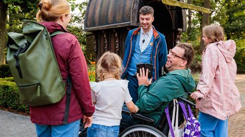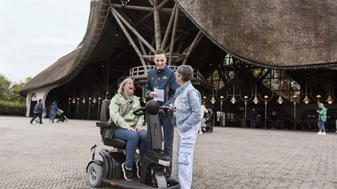 * Vous pouvez emmener un maximum de 3 personnes de votre groupe (cela inclut l’accompagnateur) par attraction accessible aux fauteuils roulants via l’entrée pour fauteuils roulants, à l'exception du spectacle Raveleijn (max. 1 accompagnateur), du train à pédales Kinderspoor (max. 1 accompagnateur) et de l'attraction familiale Symbolica (max. 2 accompagnateurs).