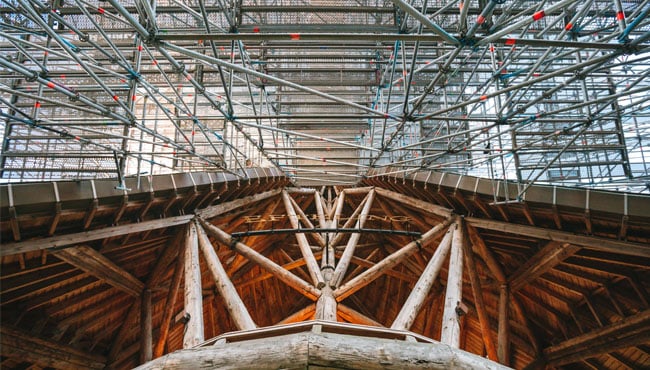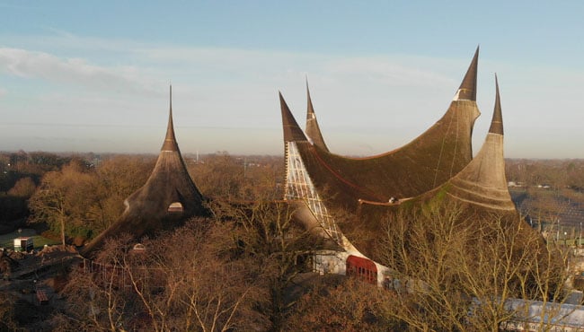 Strategisch Projectleider Peter Couwenberg: “Sinds kort staat er een imposante steiger voor de Hoofdentree. Niet alleen voor de veiligheid, maar ook om via die steiger circa 50.000 bundels riet te transporteren naar een hoogte van 27 meter. Bij normale daken is de hellingshoek circa 30 graden. Bij het Huis van de Vijf Zintuigen is de hellingshoek maar liefst 80 graden! Daarom zijn de rietdekkers gezekerd via grote kabels die aan de pieken van het gebouw bevestigd zijn. Tijdens het rietdekken staan zij op een soort trappetjes die aan het riet worden bevestigd. De rieten kap van de Hoofdentree is maar liefst 4.500 m2 groot. Riet is een natuurlijk product en vergaat met de jaren. Tijdens het onderhoud van 2017 hebben we vooral de onderkant van de kap vernieuwd. Nu gaan we een stukje hoger. Een deel van het riet hoeft alleen te worden bijgewerkt. Een ander deel, met name aan de achterkant, maken we volledig kaal. Hierdoor kunnen we ook kleine lekkages verhelpen aan het dak, voordat er weer nieuw riet wordt aangebracht. Het eerste jaar zal je waarschijnlijk kleurverschil zien tussen de oude en nieuwe gedeeltes, maar aangezien riet een natuurlijk product is, zie je daar over een jaar niks meer van. Leuk detail: het bedrijf dat in 1995 betrokken was bij de bouw van de rieten kap werkt nu ook mee aan dit onderhoud.”