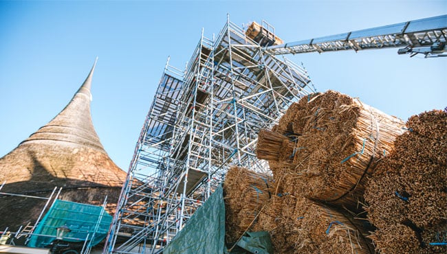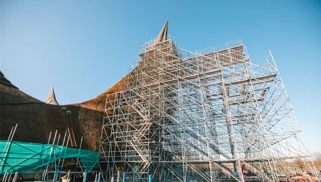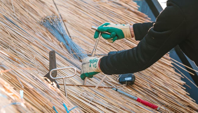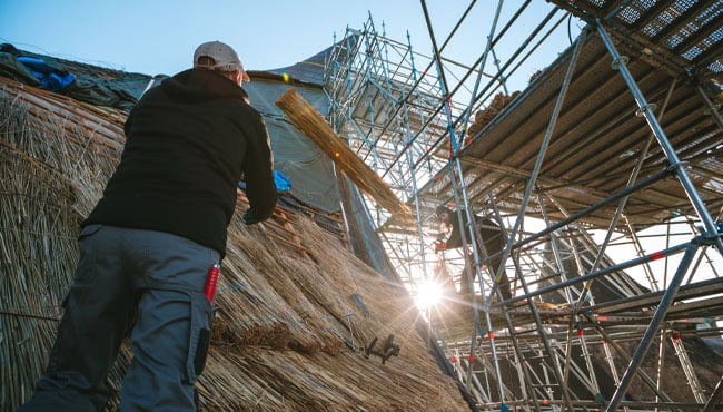 Onderhoud aan één van de grootste rieten daken ter wereld