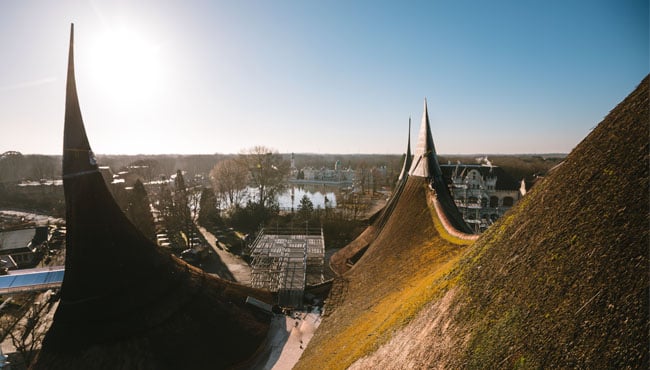 Wie de Hoofdentree nadert, ziet in de verte mensen bewegen op het dak van het Huis van de Vijf Zintuigen. Eenmaal in de buurt zie je dat het rietdekkers zijn die op grote hoogte met de hand het riet vervangen. Een uitdagende klus, want de rieten kap van de ingang van de Efteling is een van de grootste rieten daken van de wereld!