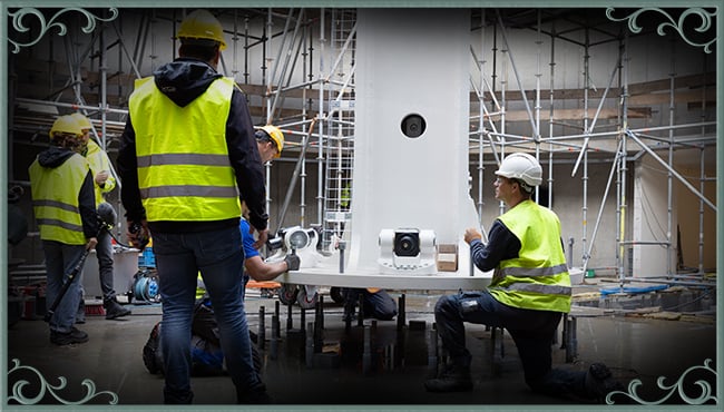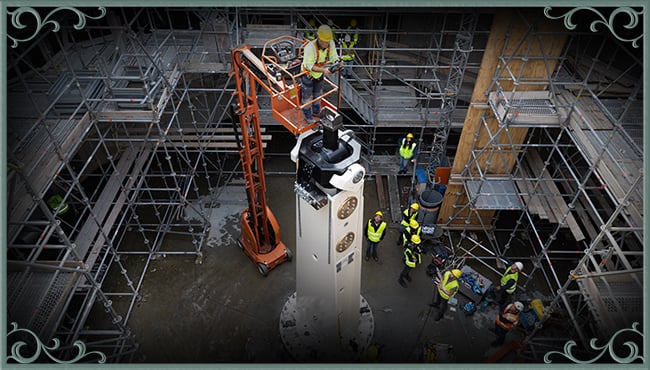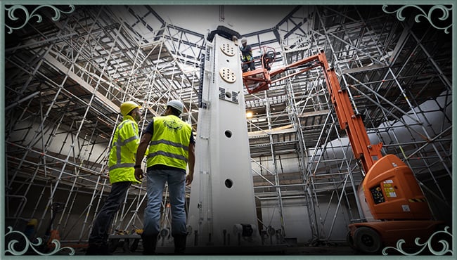 Eerder deze week kwam de mast in delen aan in de Efteling. Voordat de metershoge mast in de lucht gehesen kon worden, werd eerst de 400.000 kilo wegende hijskraan gereed gemaakt op de bouwlocatie. Het precisiewerk startte toen de mast boven de opening van de dakconstructie hing: de mast moet namelijk exact op de juiste plek staan ten opzichte van het gebouw, waterpas en op het juiste aantal graden. Eenmaal op de juiste locatie werd de mast losgekoppeld van de kraan. Hierna zal nog het tweede deel van de mast het gebouw in gehesen en gemonteerd op het eerste deel. Beide delen van de mast wegen samen 45.100 kilo en maken deel uit van de basis van het ritsysteem van de attractie Danse Macabre.
