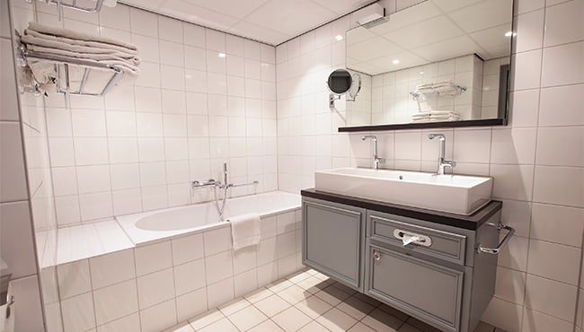 De vernieuwde badkamer is een stuk groter! Hierdoor past er niet alleen een dubbele wastafel en een bad in, maar óók een inloopdouche. De roze tegels passen helemaal binnen het thema. De badkamer is verder onder andere voorzien van fijne badjassen en shampoo, bodywash en handzeep uit de Efteling-collectie van The Gift Label.