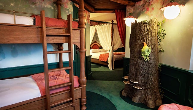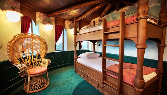 Het slaapgedeelte met het stapelbed bevindt zich in de toren van het Efteling Hotel, waar je wegdroomt onder het houten plafond met bloemen. Twee kinderen slapen in het stapelbed en er is een verborgen extra slaapplaats. Naast het bed kun je zitten in een prachtige pauw-fauteuil, het lijkt wel een elfentroon!