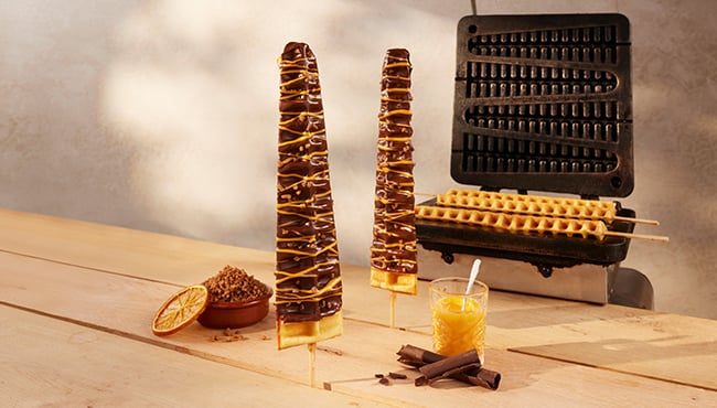 Bij Den Suykerbuyk op het Anton Pieckplein geniet je van een versgebakken wafel op stok, gedoopt in pure chocolade met sinaasappel-drizzle en bestrooid met kaneelcrunch.