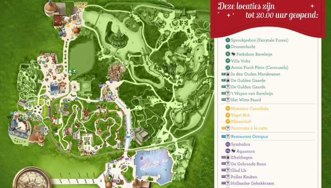 Tot 20.00 uur kun je genieten van alle sprookjes in het Sprookjesbos, een aantal molens op het Anton Pieck Plein en de attracties Droomvlucht, Villa Volta, Vogel Rok, Monsieur Cannibale en Symbolica.