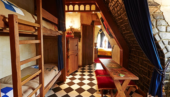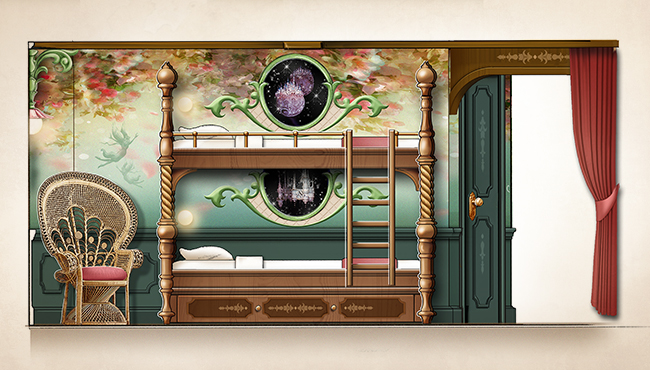 Het slaapgedeelte met het stapelbed bevindt zich in de toren van het Efteling Hotel, waar je wegdroomt onder het houten plafond met bloemen. Twee kinderen slapen in het stapelbed en er is een verborgen extra slaapplaats. Naast het bed kun je zitten in een prachtige pauw-fauteuil, het lijkt wel een elfentroon!