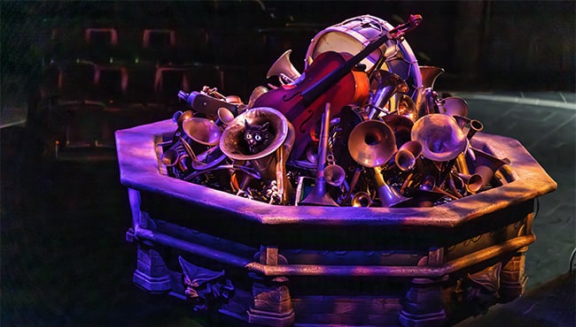 Eén van de spannendste elementen in Danse Macabre vind ik zelf het verschijnen van de monsterkat. Aan het begin van de show slaat de bliksem in op de muziekinstrumenten in het midden van de kapel en verandert het kleine katje, dat daar tot dan toe nog zit te spelen, in de monsterkat. Aanvankelijk wilden we dit laten zien. We hebben schetsen gemaakt van een monsterkat-figuur die daadwerkelijk omhoogkomt uit die muziekinstrumenten. Maar net als in een goede griezelfilm laten we iets meer aan de verbeelding over. Je hoort hem wel en je voelt hem om je heen lopen. En uiteindelijk vliegt hij naar boven en begint de Danse Macabre te spelen.