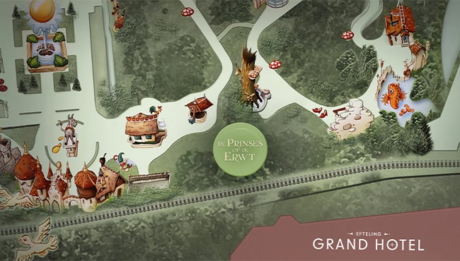 Het tafereeltje van het nieuwe sprookje De Prinses op de Erwt krijgt een prachtige plek aan de rand van het bos tussen de bekende sprookjes Vrouw Holle en de Trollenkoning. Het majestueuze Efteling Grand Hotel vormt de perfecte achtergrond voor het nieuwe sprookje, dat met dezelfde stijlelementen wordt gebouwd.