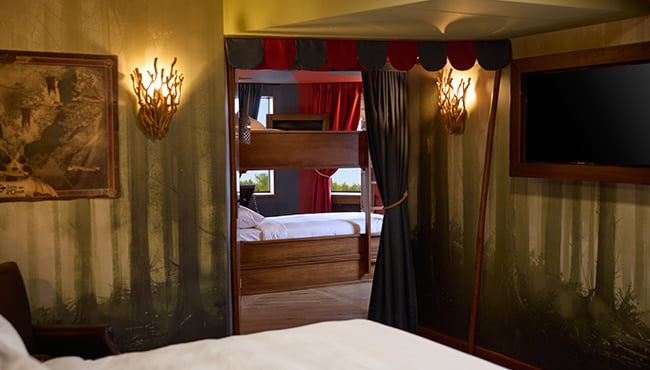 Dappere drakenstrijders slapen in deze ruime themasuite voor vijf personen. In één van de torens van het Efteling Wonder Hotel waan je je in het moeras waar de draak huist.