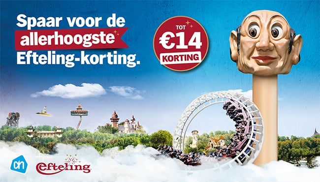Tegen inlevering van een volle spaarkaart ontvang je € 14,- korting op één Efteling-ticket. Kies voor een Flexibel ticket voor € 42,- (€ 14,- korting op € 56,-) of een Laagseizoen ticket: € 33,- (€ 14,- korting op € 47,-). Let op, er kan maximaal één volle AH Efteling-spaarkaart worden ingeleverd per Efteling-ticket.