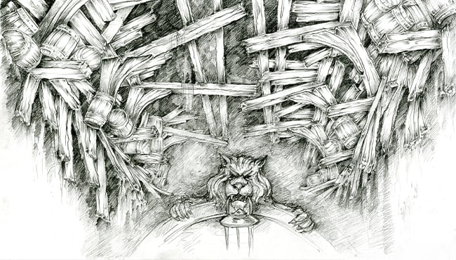 Karel: “Vlak vóór dat je de helling opgetakeld wordt, valt je sloep met een ruk stil in een hoek van 45 graden. Hier verscheen het hoofd van Willem van der Decken even boven je, voordat het in een grijnzende schedel veranderde. Vanaf eind april kom je, nadat je bent opgeslokt door De Vliegende Hollander, echt even midden in het brandende scheepswrak terecht, waar rook de bungelende vaten en draperieën omringt. Het staat symbool voor het binnenste van de verrotte ziel van Willem van der Decken. Wij horen hier niet thuis. Pas wanneer de sloep zijn weg naar boven vindt, ontsnap je aan dit spookschip.”