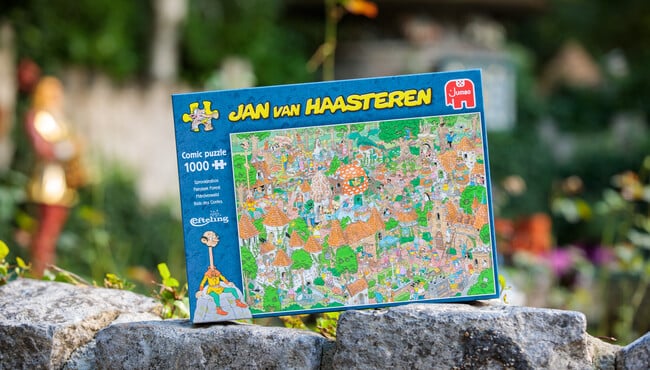De nieuwe komische legpuzzel van Jan van Haasteren is gemaakt van 100% gerecycled card board en bestaat uit 1000 stukjes. Op de puzzel ontdek je herkenbare elementen uit Fata Morgana. Zo is de Djinn van de partij, zie je souvenirwinkel De Bazaar en herken je natuurlijk één van de bootjes. Naast de Efteling-elementen zijn ook de typische Jan van Haasteren kenmerken te ontdekken in deze puzzel. Zie jij de haaienvin, octopus, kunstgebit, zelfportret van Jan van Haasteren en Sinterklaas?