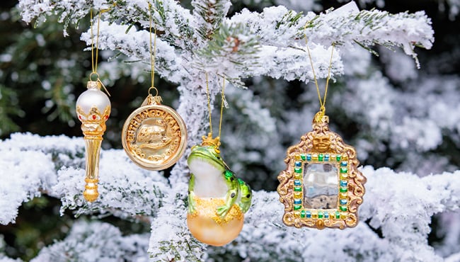 Hang een sprookje in je boom! Deze Winter Efteling zijn vier nieuwe glazen hangornamenten (€ 15,-) verkrijgbaar: een kikker op een gouden bal, een gouden Efteling-dukaat, een twinkeltoorts en de spiegel van de boze stiefmoeder. Weet jij welk sprookje bij elk ornament hoort?
