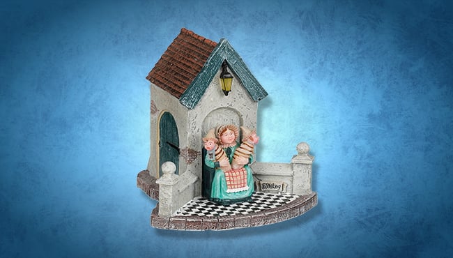 Moeder met de hongerige tweeling Gijs vind je op het Anton Pieck Plein. En nu ook als exclusief miniatuur van 12 x 11 x 11 centimeter met licht én geluid (€ 45,-).