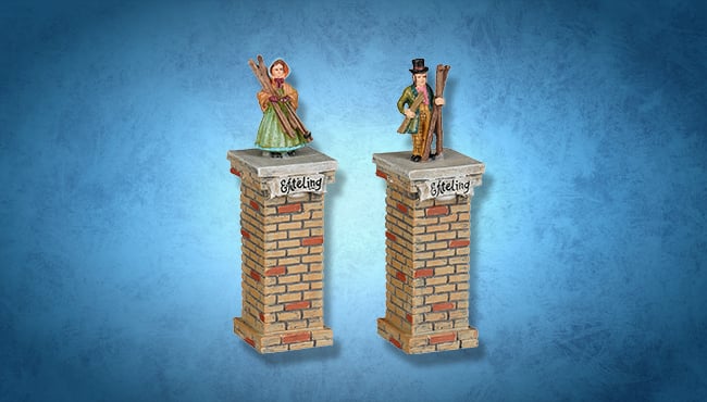 De reizigers vind je in de Efteling bij het Kinderspoor. Ze krijgen dit jaar hun eigen duo-miniatuur met winterse attributen (€ 20,-) met de afmetingen 2 x 2 x 7,5 centimeter.