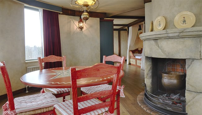 De Oudhollandse zithoek heeft ramen helemaal rondom. De kookpot pruttelt gezellig boven een knisperend vuurtje en de nostalgische lamp geeft extra veel sfeer. Plof met zijn allen neer op de ouderwetse stoeltjes. Na een dag in de Efteling is er toch niks gezelligers dan samen een spelletje spelen aan oma’s tafel bij de open haard?