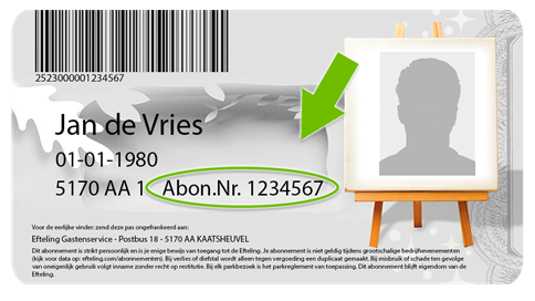 Let op: jouw abonnementsnummer vind je op je abonnementspas, zie het voorbeeld.