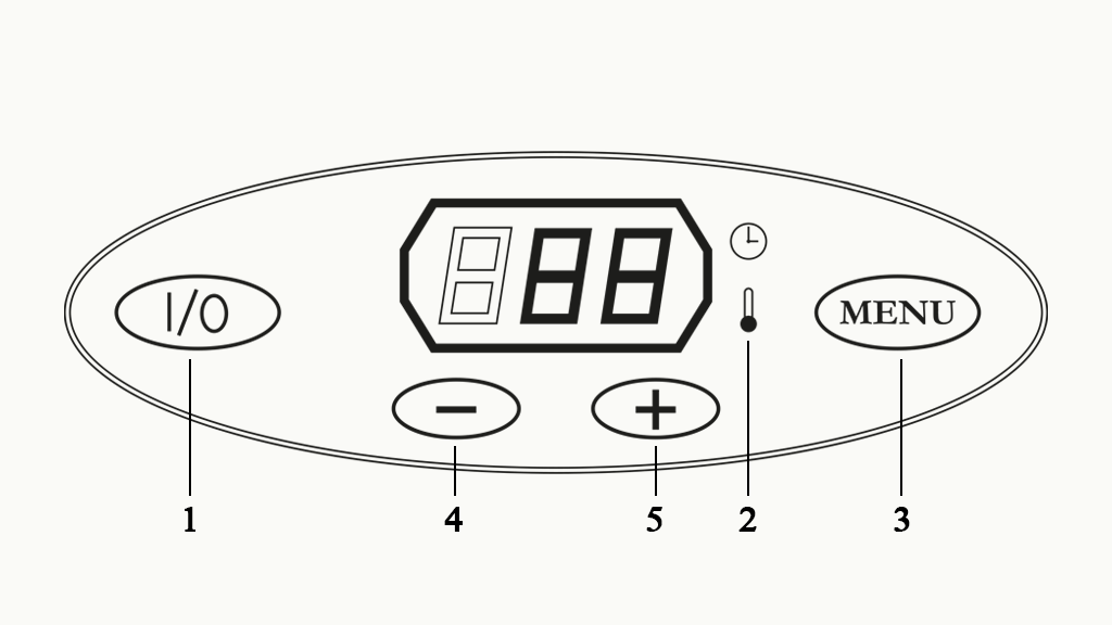 - De bediening wordt 10 seconden nadat de warmte geselecteerd is uitgeschakeld. Om de warmtestand aan te passen, dien je eerst op toets 2 te drukken en verander je de temperatuur door op één van de toetsen 3 te drukken.